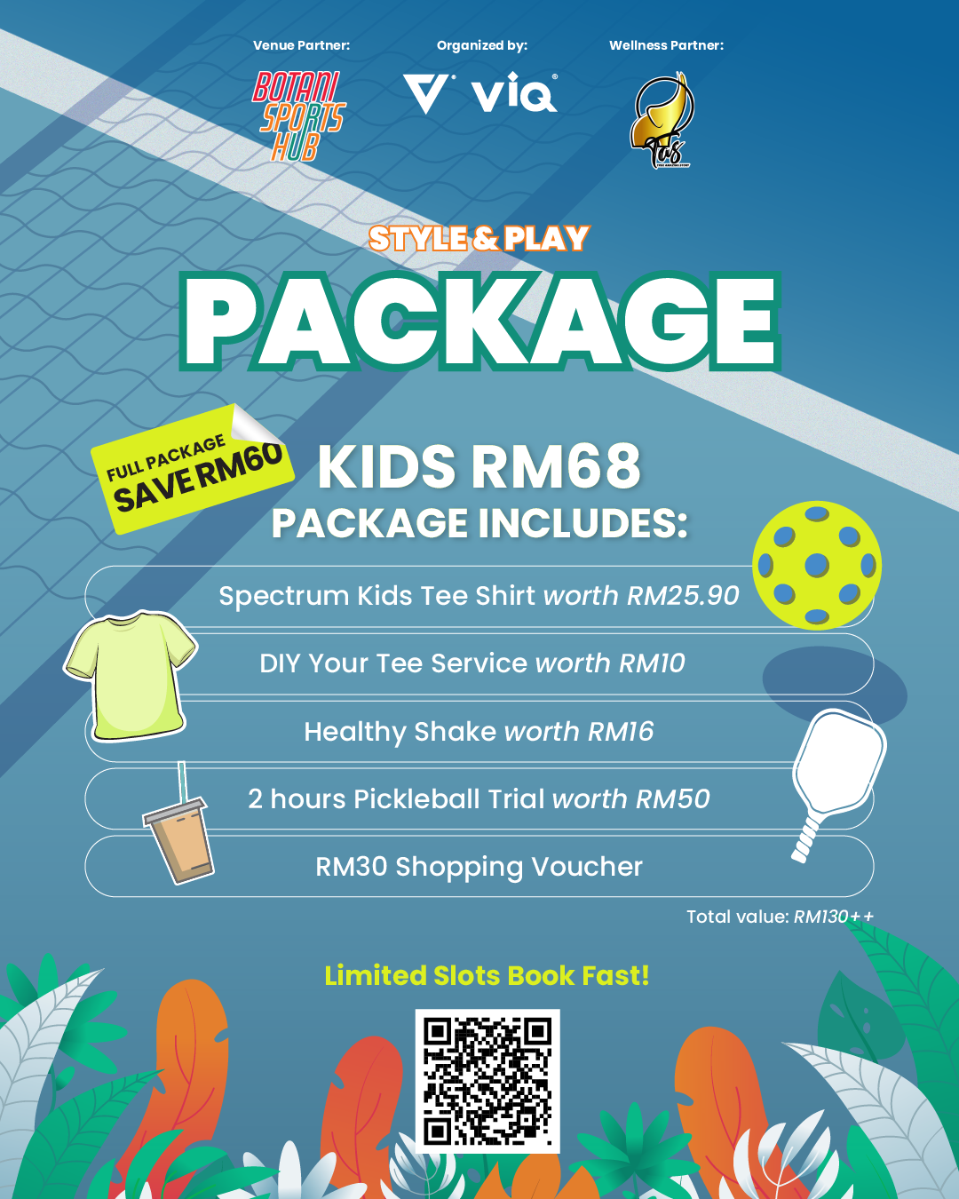 Kids aged 4 to 12 can enjoy a similar package for RM68, valued at RM130++, which includes a Spectrum Kids Tee, DIY Your Tee Service, a healthy shake, a two-hour pickleball trial, and a RM30 shopping voucher.