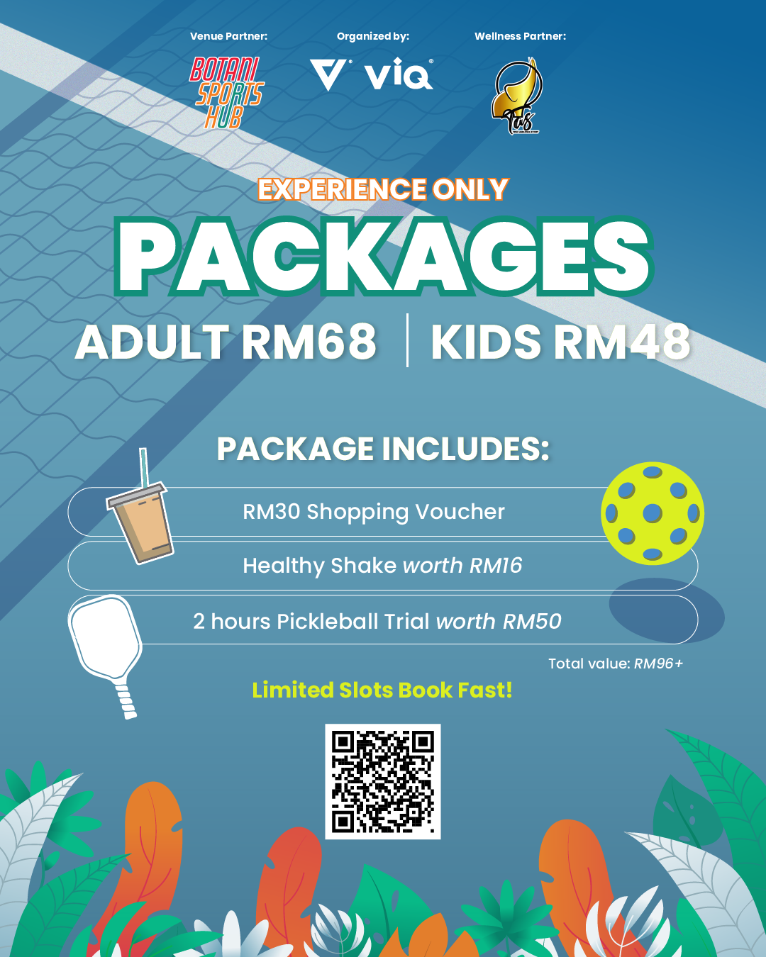 For those who already have their gear and outfit but still want the experience, the Experience Only Package is available at RM68 for adults and RM48 for kids, including a shopping voucher, a healthy shake, and the pickleball trial.