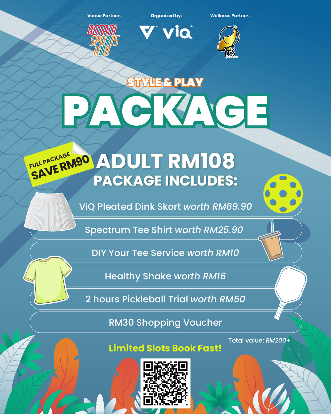 For adults, the Style & Play Package is priced at RM108 and offers value worth RM200. It includes a ViQ Pleated Dink Skort, Spectrum Tee Shirt, DIY Your Tee Service, a healthy shake, a two-hour pickleball trial, and a RM30 shopping voucher.