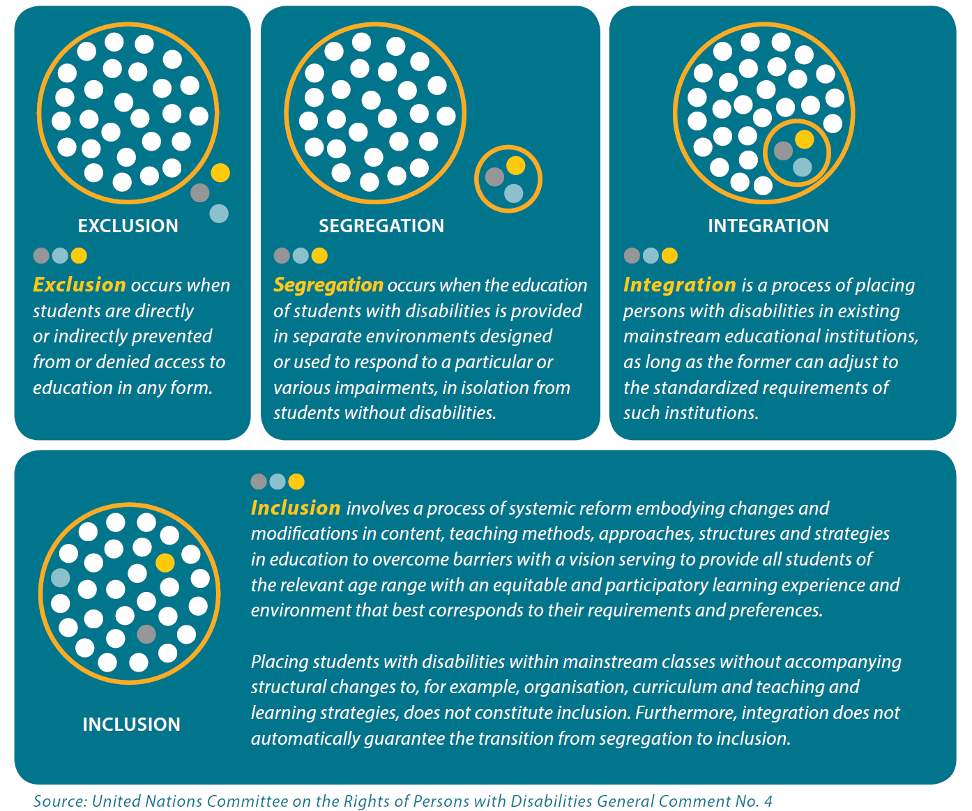 Over the past four to five decades, disability services for children in many progressive nations have shifted from a system of exclusion to segregation to integration and now to one of inclusion. This is in accordance with the principles outlined in the Convention on the Rights of Persons with Disabilities (CRPD). This is best illustrated by a diagram explaining exclusion, segregation, integration and inclusion according to the CRPD. (see attached diagram)