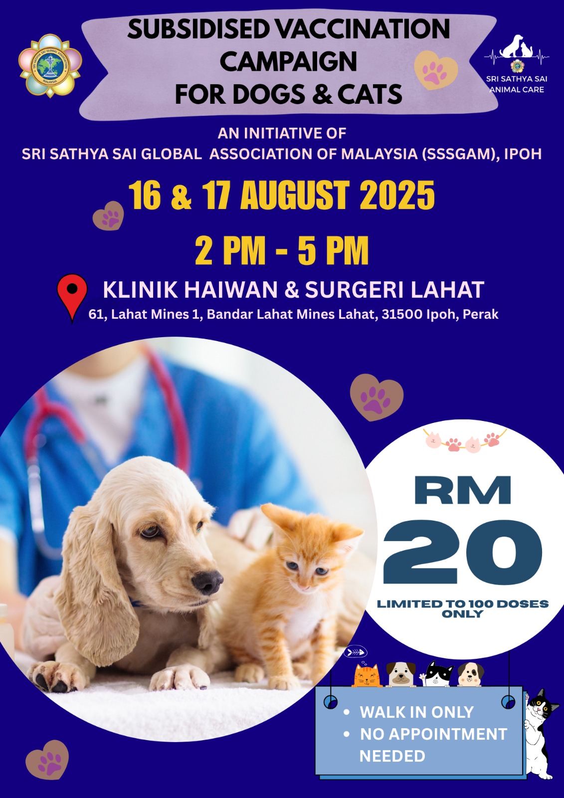 To ease this burden and ensure that every dog and cat receives the protection they deserve, Sri Sathya Sai Animal Care, a service sub-wing of the Sri Sathya Sai Global Association of Malaysia (SSSGAM), together with SSSGAM Ipoh, is organising a Subsidised Vaccination Campaign for Dogs & Cats. This initiative is open to all pet owners, rescuers, and animal shelters.