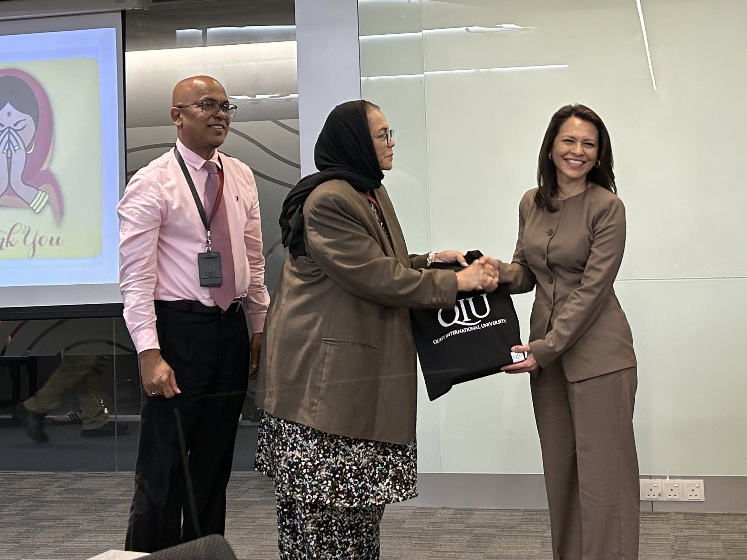 Prof. Dr. Sivabala [left] and QIU Vice-Chancellor Prof. Zita Mohd Fahmi [centre] presenting a token of appreciation to Dr. Thaera O’Brien [right].