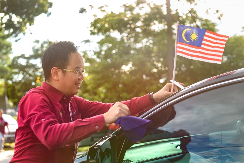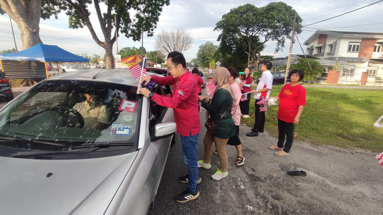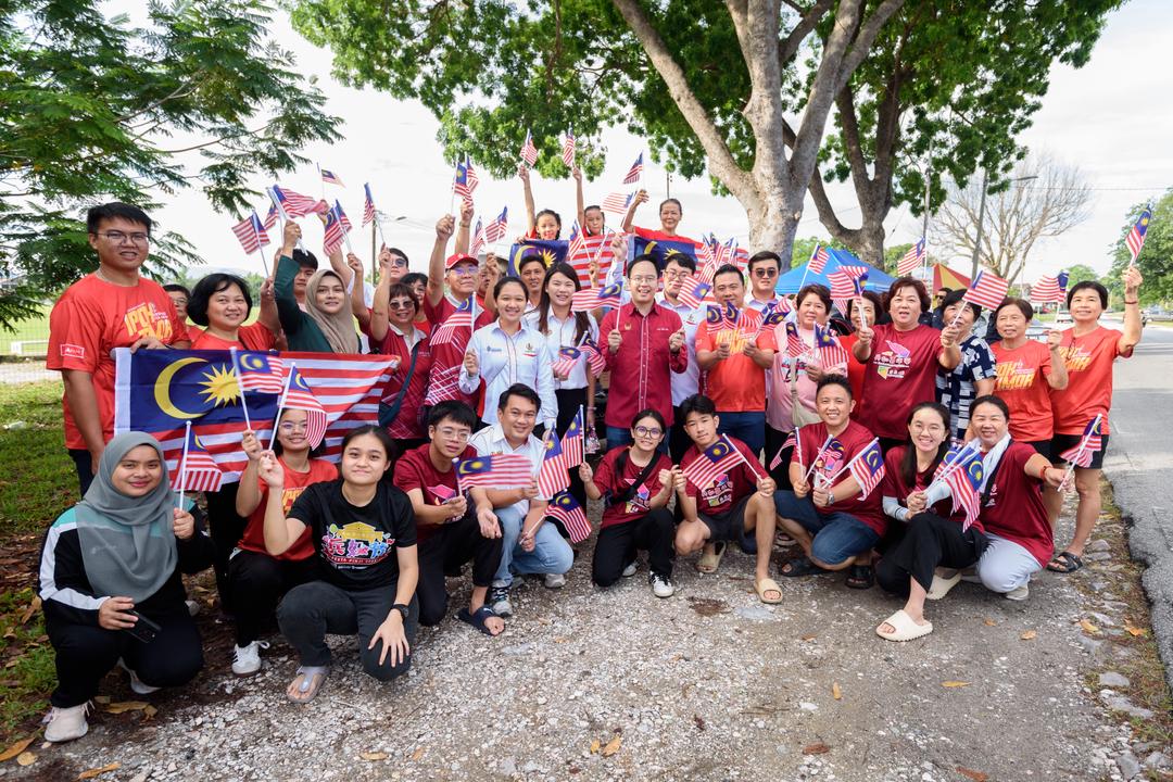 Pasir Pinji ADUN YB Goh See Hua, together with City Councillor Jayden Lim, Village Head Kelly, the Village Community Management Council (JPPK) of Pasir Pinji New Village, and their team members, gathered at the Kelab Kilat Field, the temporary market nearby, to hand out the Jalur Gemilang to the public.