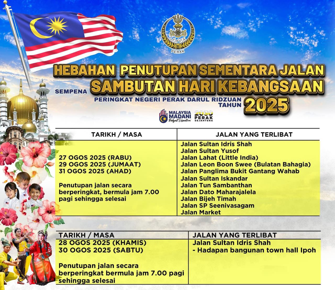 IPOH: Members of the public planning to travel to the city centre are advised to take note of temporary road closures involving several main roads in conjunction with the preparations and celebration of the Perak State-Level National Day 2025.