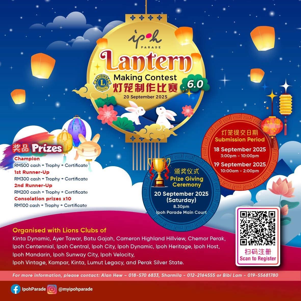 The prize-giving ceremony is scheduled for September 20, 2025 (Saturday), at 8.30pm at Ipoh Parade’s Main Court, and will be preceded by a special Lantern Parade featuring an LED Lion Dance performance.