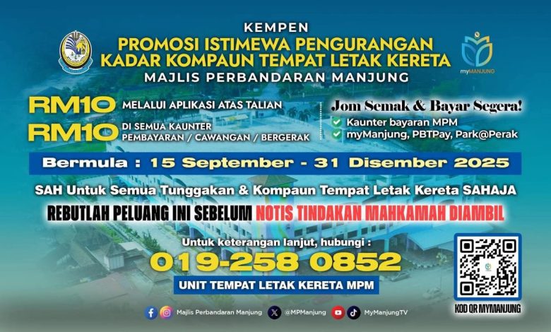 The Manjung Municipal Council (MPM) is now offering an exceptional discount on all parking compound fines, including old outstanding fines, which can be settled for just RM10.