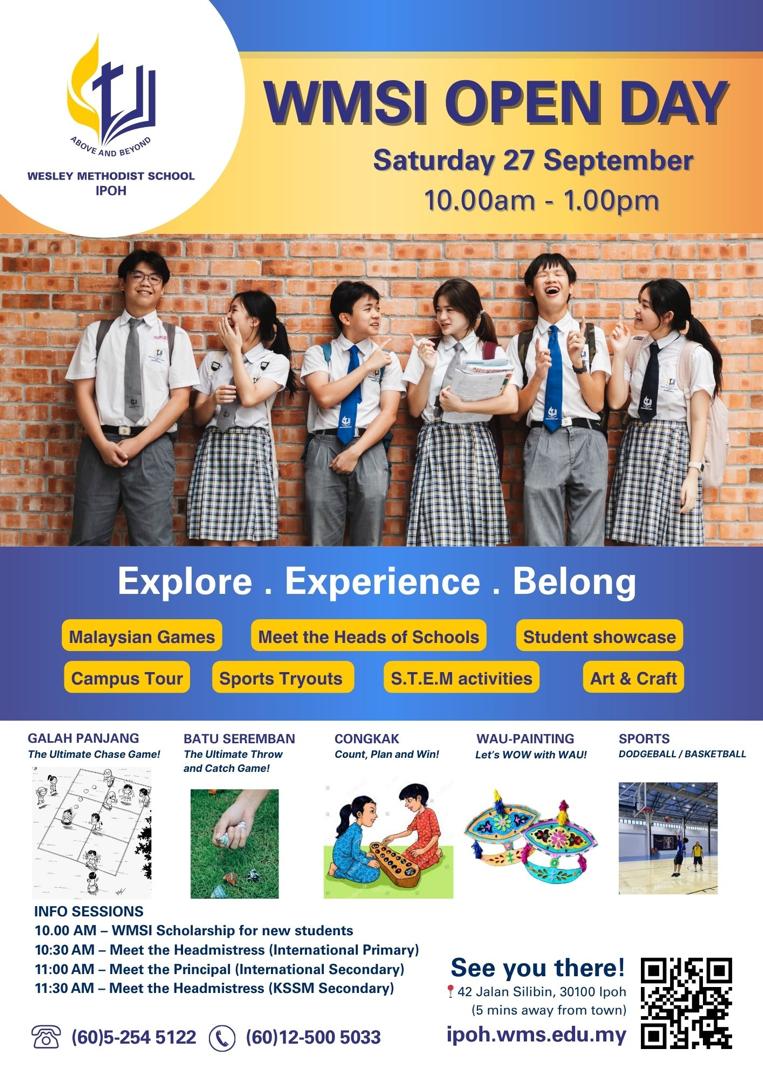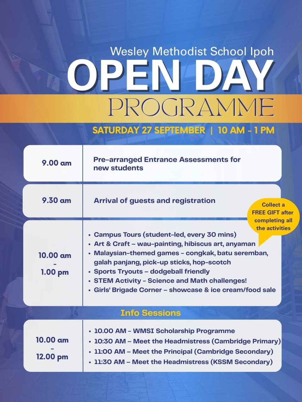 Wesley Methodist School Ipoh (WMSI), a school with more than 100 years of legacy in education, is opening its doors for a special Open Day on Saturday, 27 September 2025, from 10.00 am to 1.00 pm.