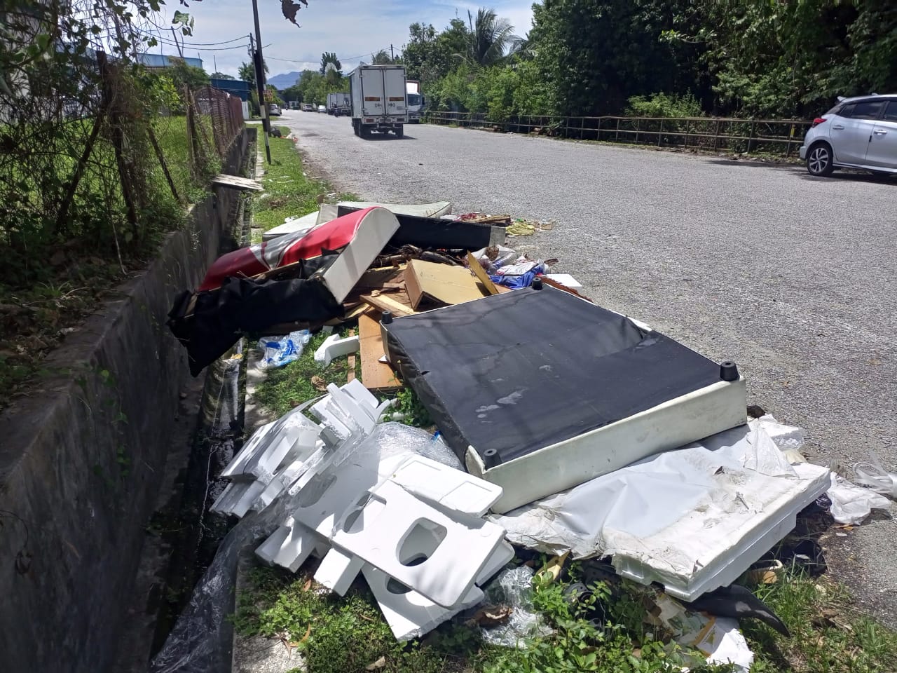 Items dumped include mattresses, broken sofas, polystyrene containers, and domestic waste, all reportedly discarded repeatedly in the same spot.