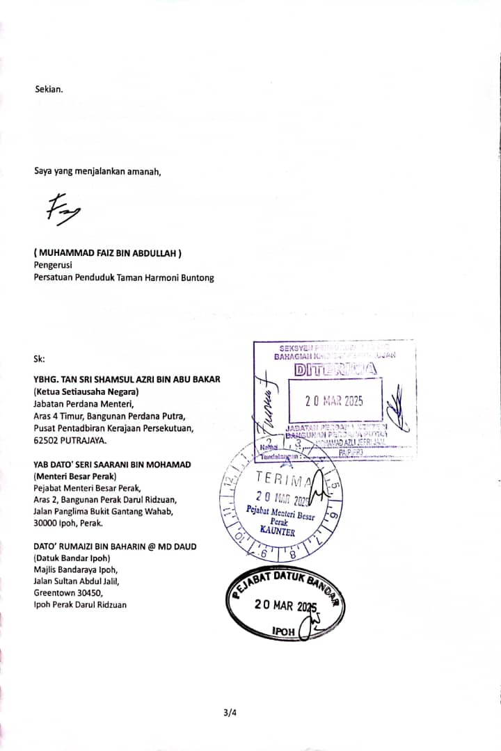 “We submitted our memorandum with more than 200 signatures on March 20, 2025, to the Prime Minister’s Office, KPKT, and the Perak Menteri Besar,” Faiz reported.