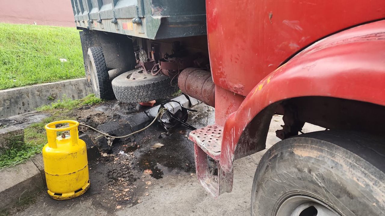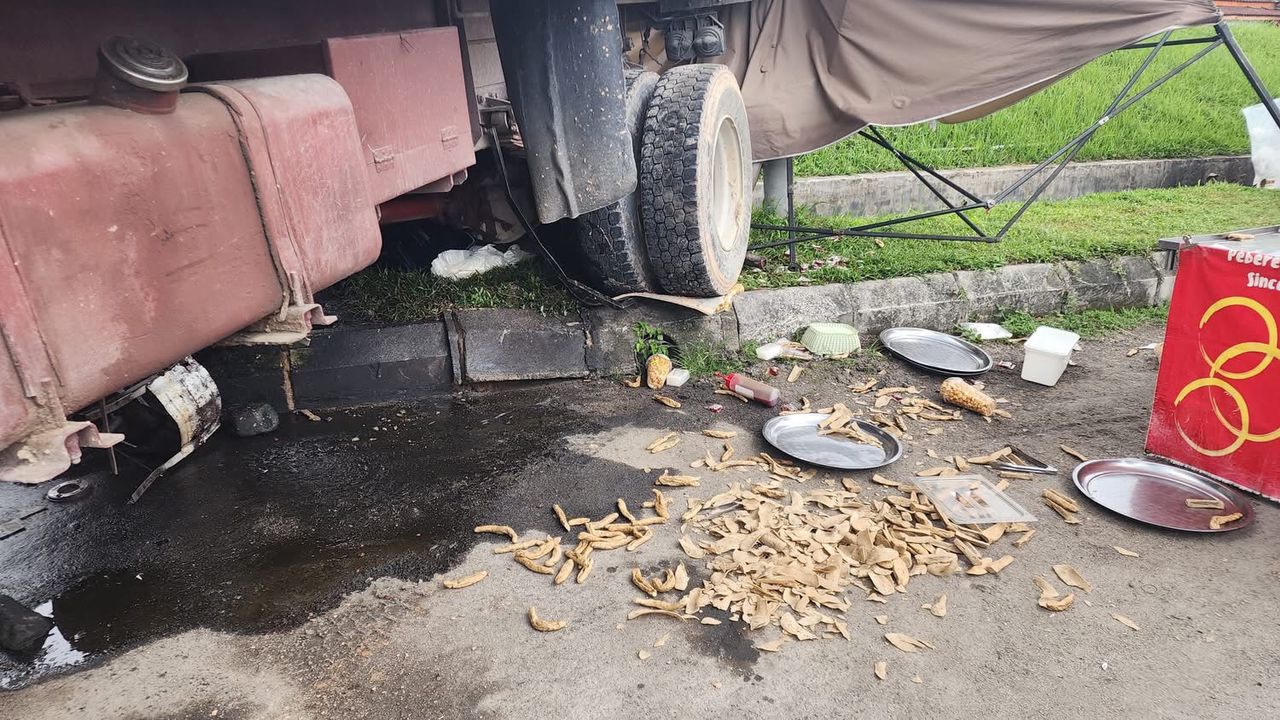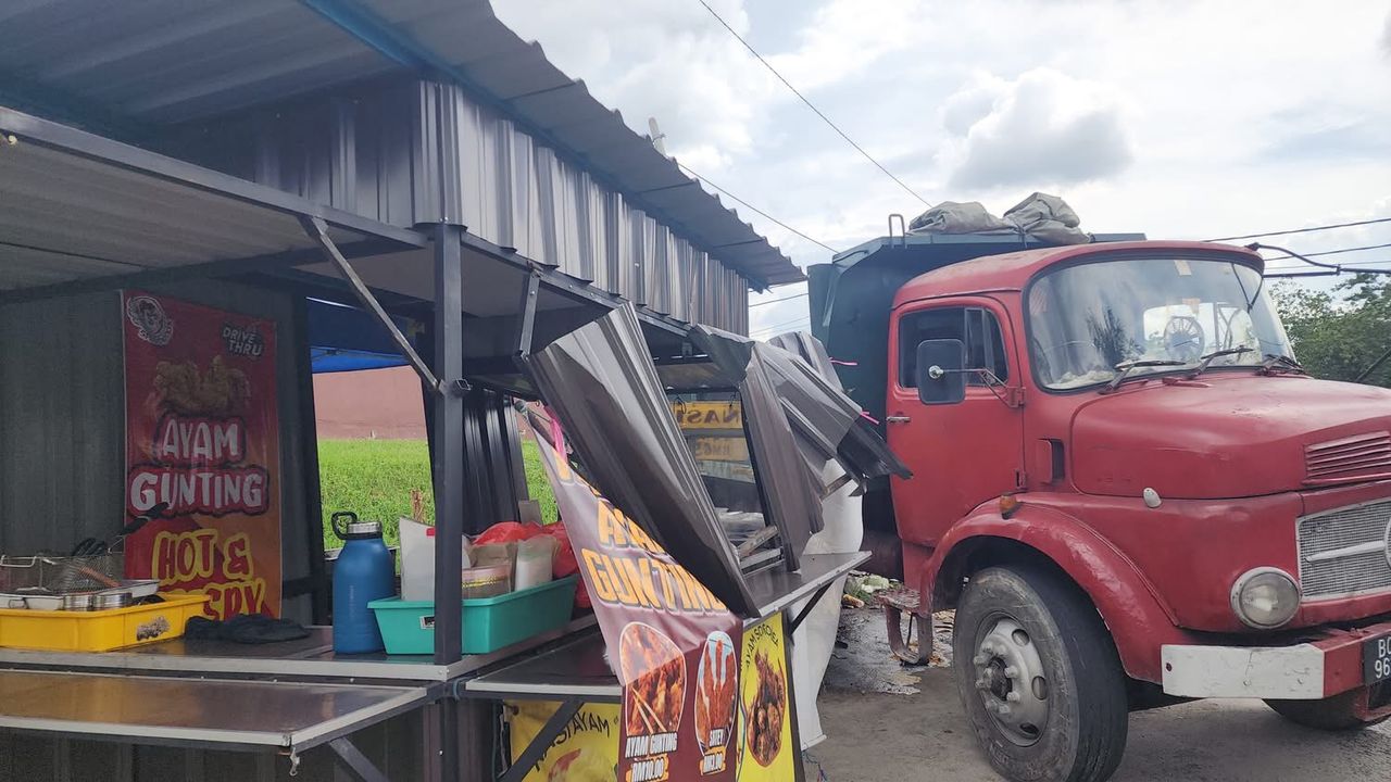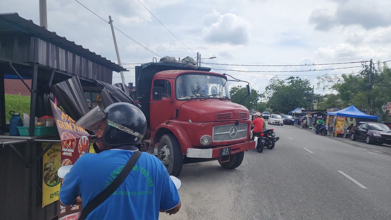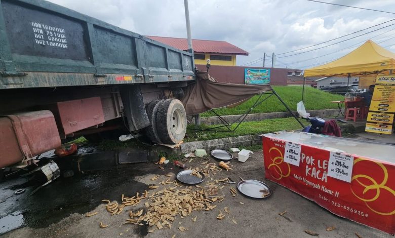“According to the traders there, the truck was left with its engine running (while buying food) at the top of the hill when it slid down and crashed into the keropok lekor stall and the fried chicken stall. Thankfully, no lives were lost.