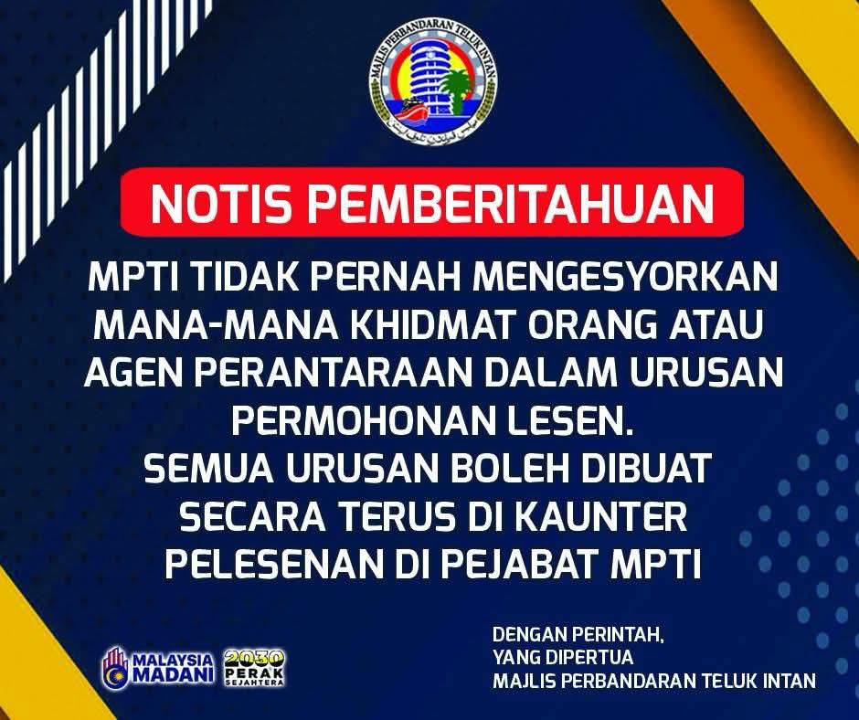 TELUK INTAN: The Telok Intan Municipal Council (MPTI) has stressed that it has never appointed or recommended any individual or intermediary agent to handle licence applications.