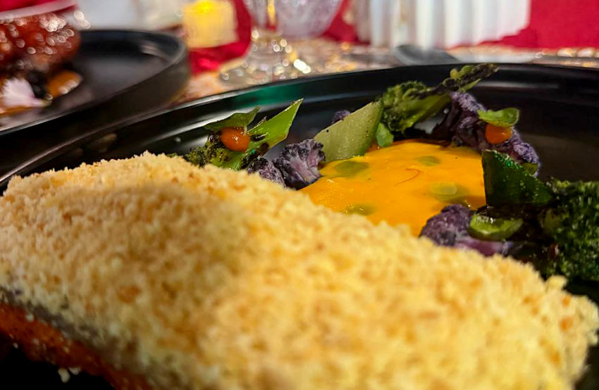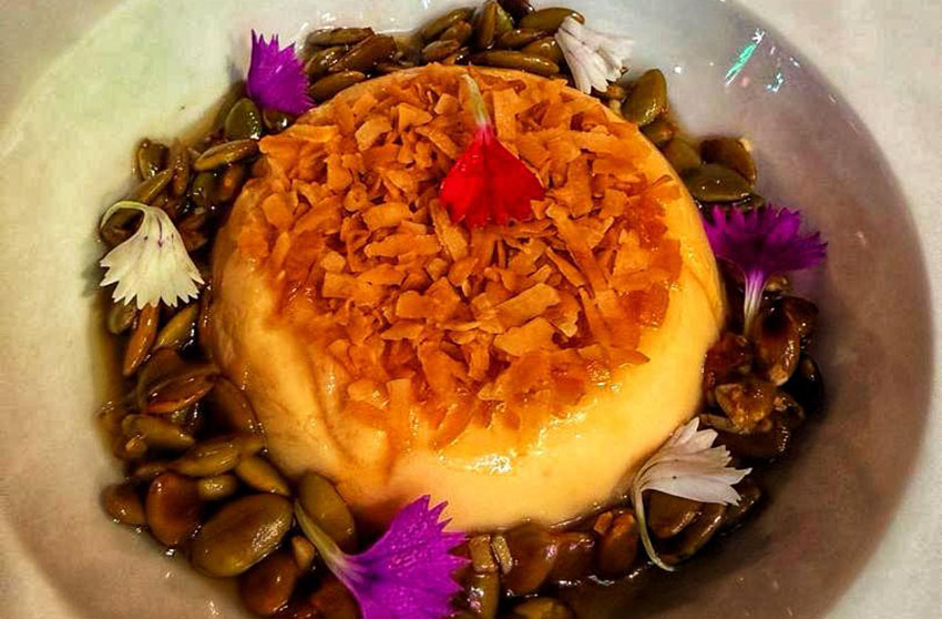The romantic evening concludes with Classic Caramel Pudding Marzano, soft and sweetly balanced, garnished with toasted coconut and pumpkin seeds.