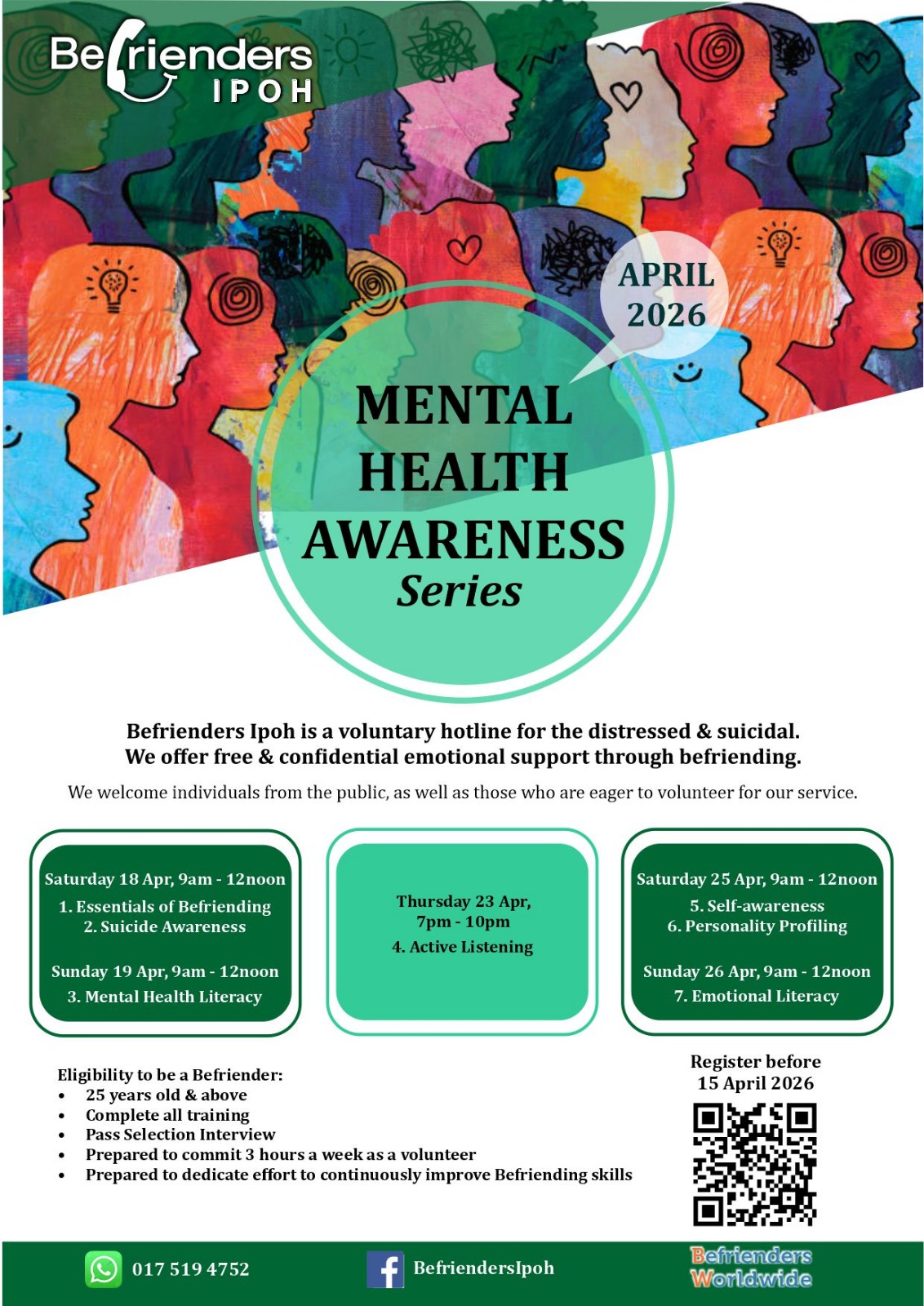 Befrienders Ipoh proudly announces the launch of its 1st Mental Health Awareness Series in 2026, a community initiative designed to raise awareness about mental health and suicide prevention while encouraging volunteer participation.