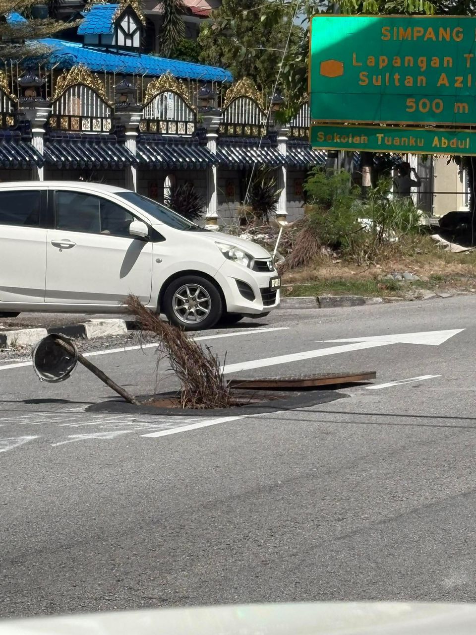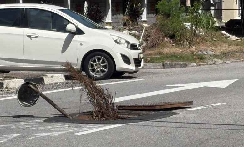 A road user said the manhole was left wide open, with members of the public placing palm fronds and pieces of wood as a warning sign for other motorists.