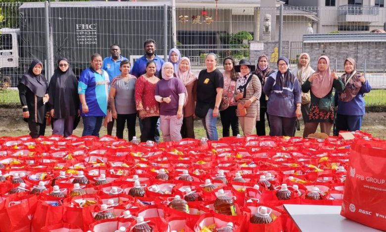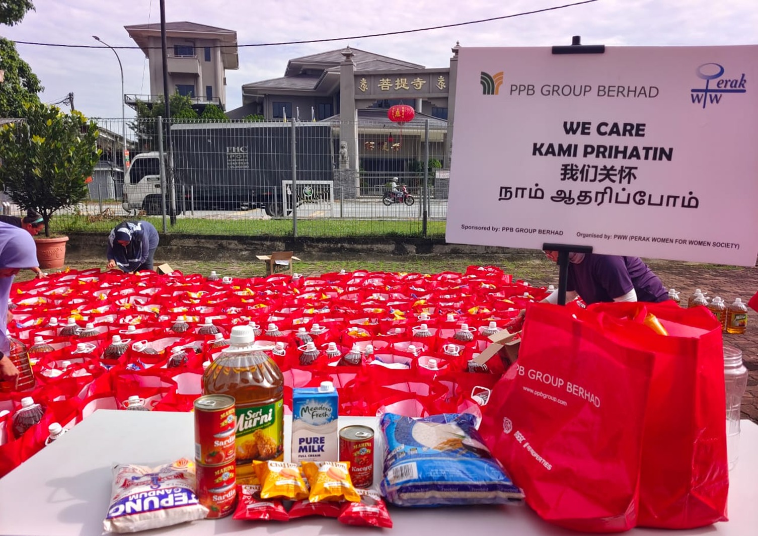 Rows of bright red food bags lined the grounds of PPR Taman Harmoni Buntong on March 15th as volunteers prepared to distribute aid to residents ahead of Hari Raya Aidilfitri.