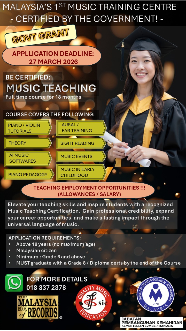 This Music Teaching SKM is a nationally recognized qualification awarded by the DSD, under the Ministry of Human Resources. Graduates of this training programme will be able to teach comfortably well either privately or at music schools.