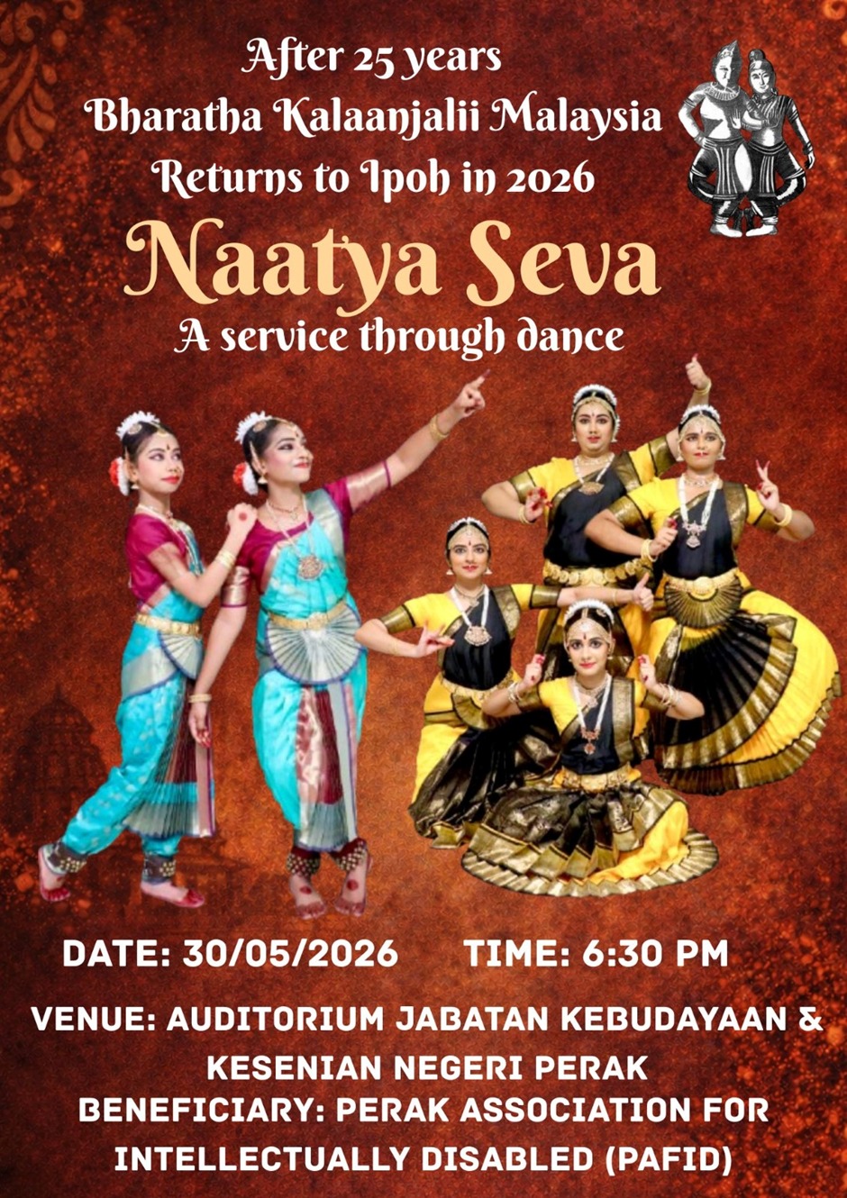 Ipoh’s arts community will soon have the opportunity to enjoy the art of classical Bharatanatyam as Bharatha Kalaanjalii Malaysia presents Naatya Seva, with proceeds going to the Perak Association for the Intellectually Disabled.