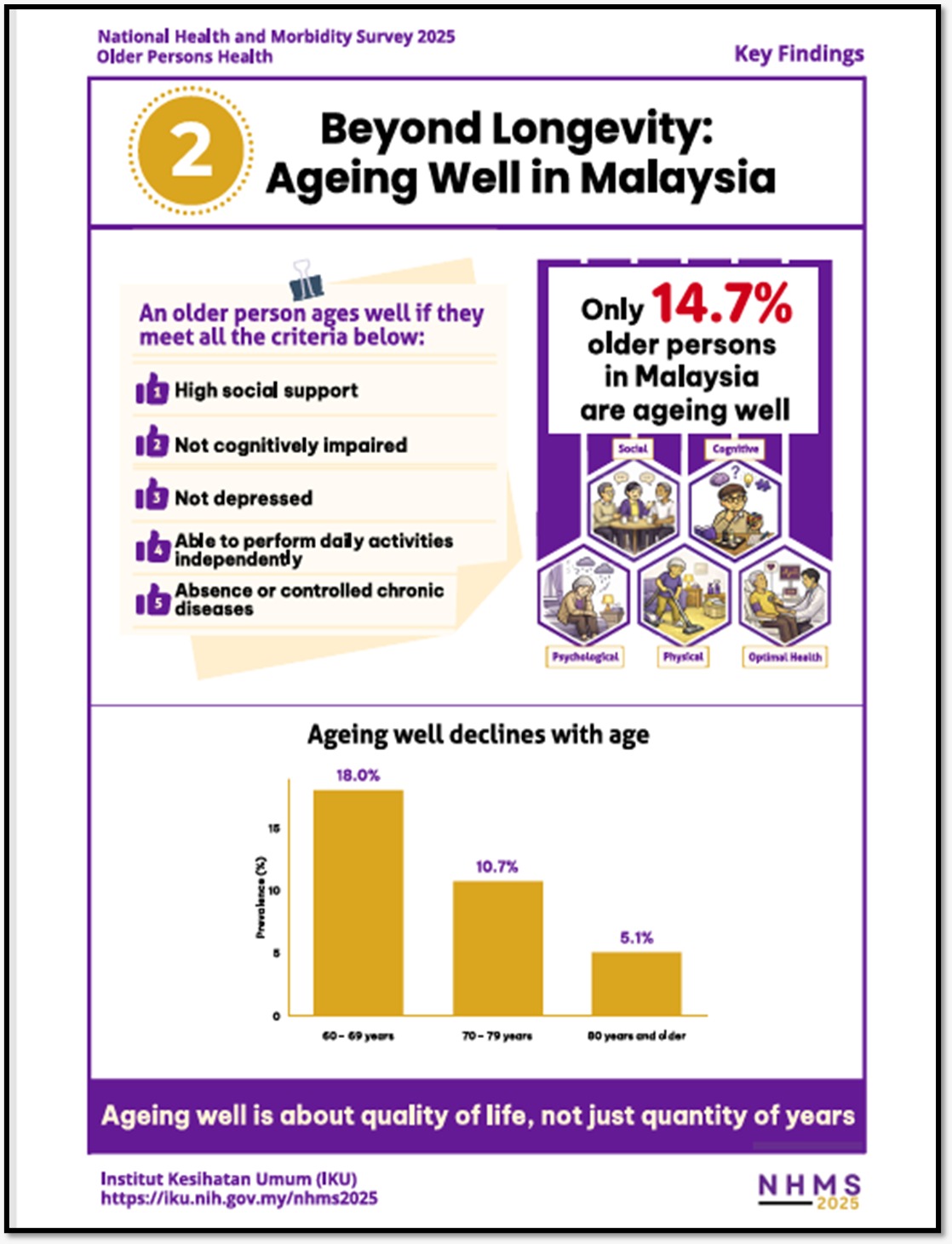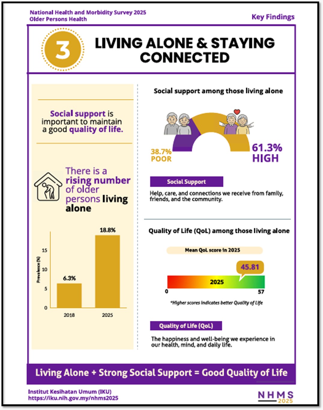 Lifestyle factors also play a role. Around 3 in 10 seniors are not physically active, while a growing number of older Malaysians are living alone. Nearly 4 in 10 report low levels of social support, highlighting how isolation can affect overall well-being.